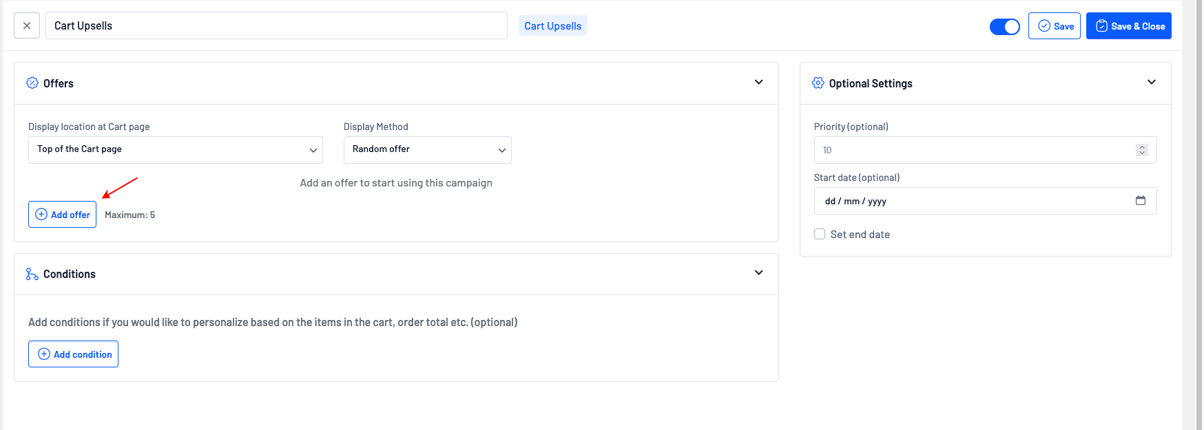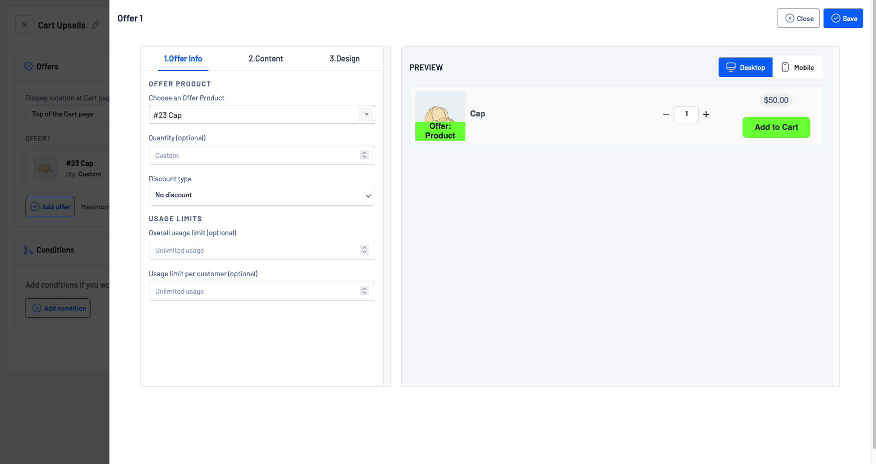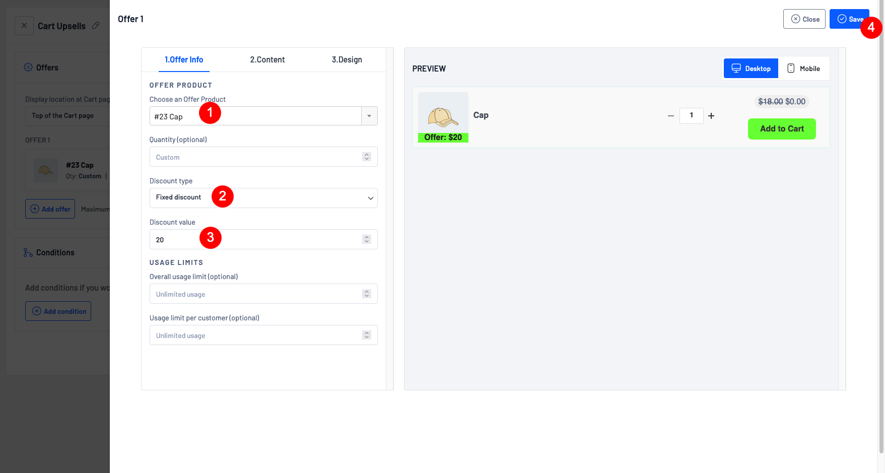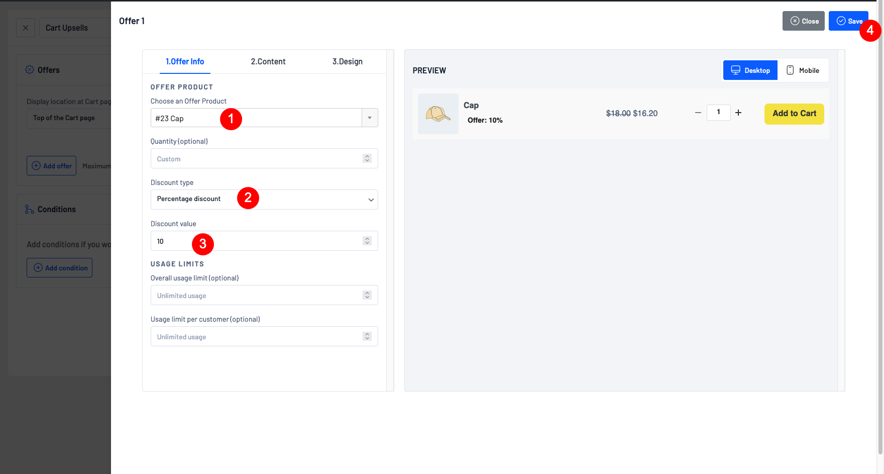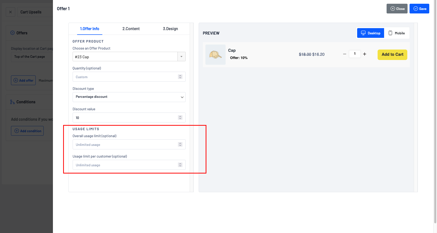**Usage limit per customer:** The “Usage limit per customer” refers to a restriction on the number of times a specific upsell offer can be claimed by an individual customer. It sets a maximum limit on the usage of the upsell for each customer.