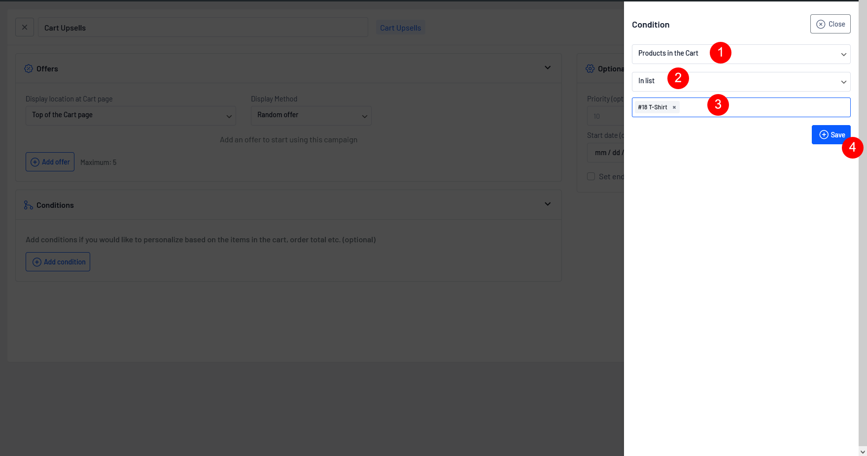 **Step 4:** Now to add a condition click on the "Add condition" button and choose "Products in the cart" -> In list -> T-shirt, by following these steps you'll able to display the Upsell offer cap when the customer's cart contains a T-shirt.