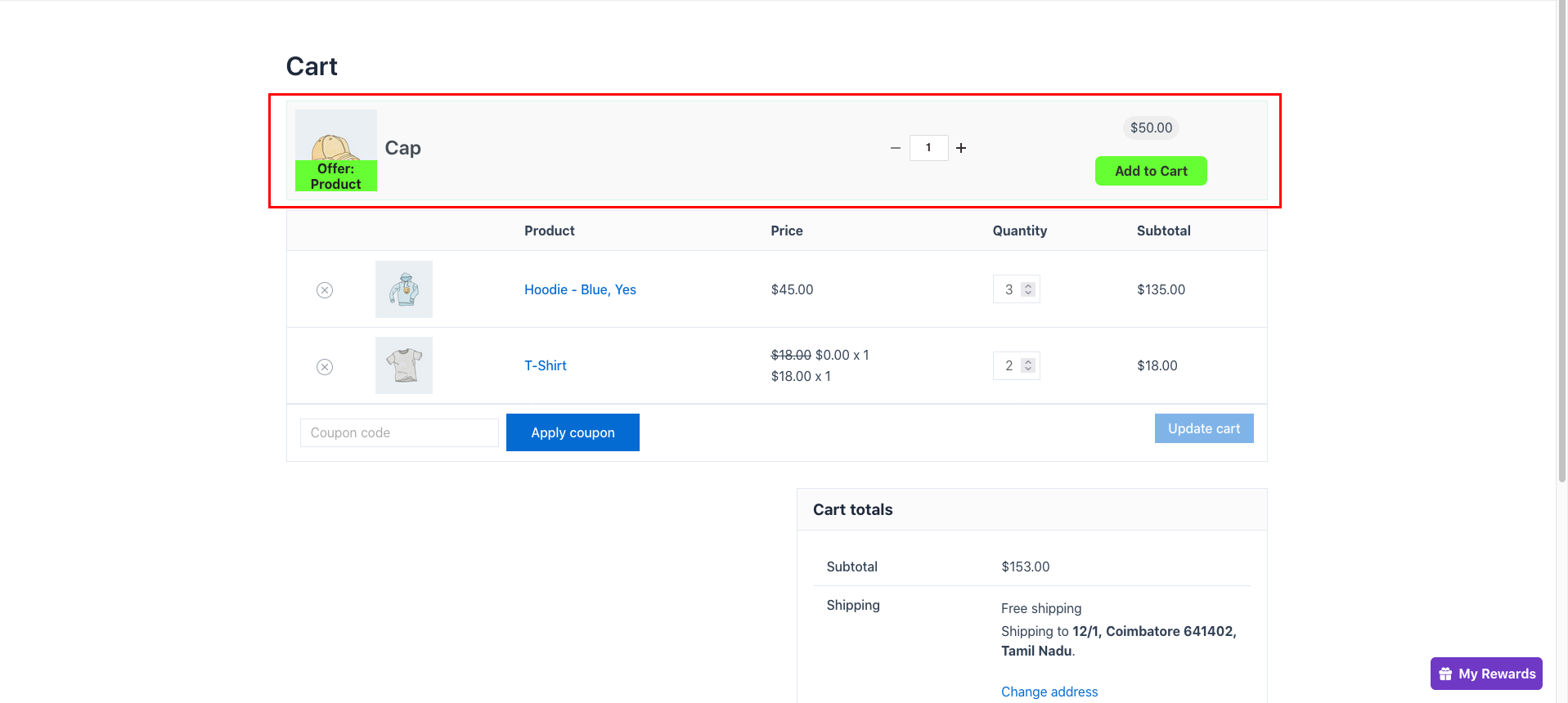 In this scenario, when the customer adds a T-shirt to the cart they have a discount on the Cap of 10% on the Cart page before proceeding to checkout.