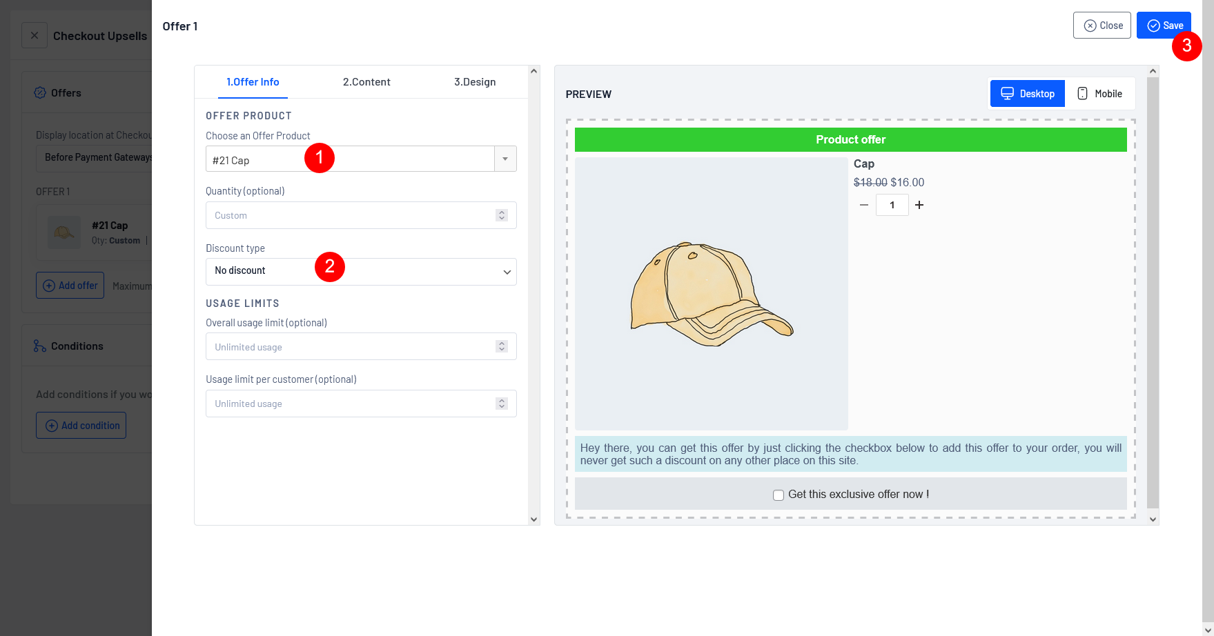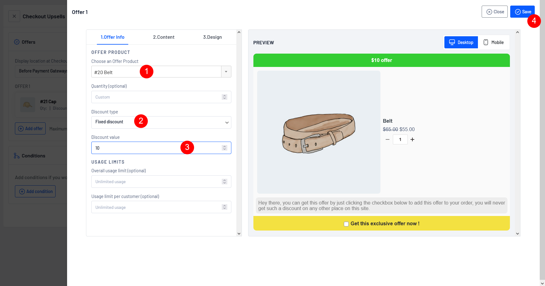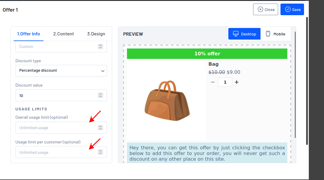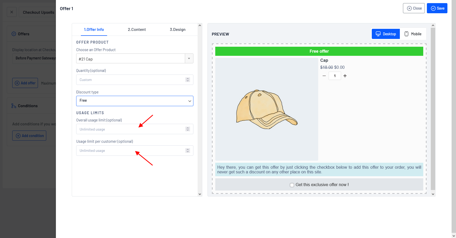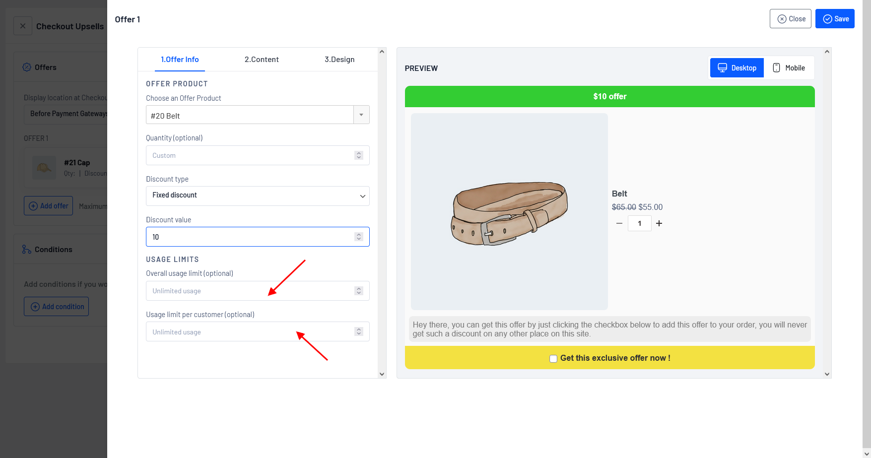 **Usage limit per customer**: The “Usage limit per customer” refers to a restriction on the number of times a specific upsell offer can be claimed by an individual customer. It sets a maximum limit on the usage of the upsell for each customer.