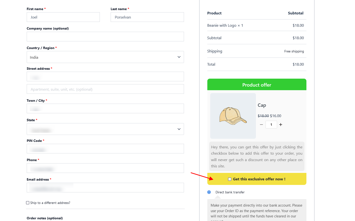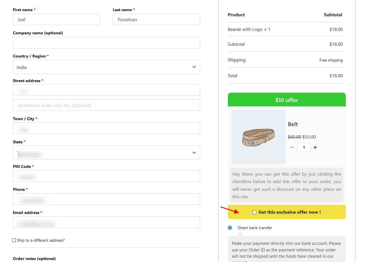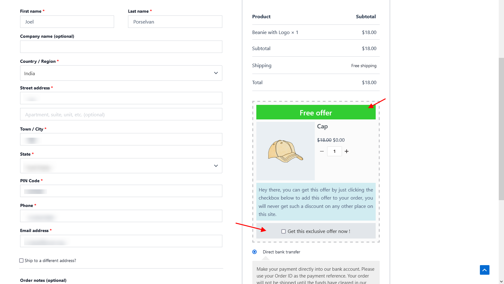 Now the offered product has been successfully displayed on the checkout page. Please ensure to select the checkbox to avail the offered product at checkout.