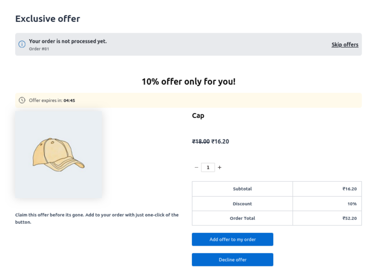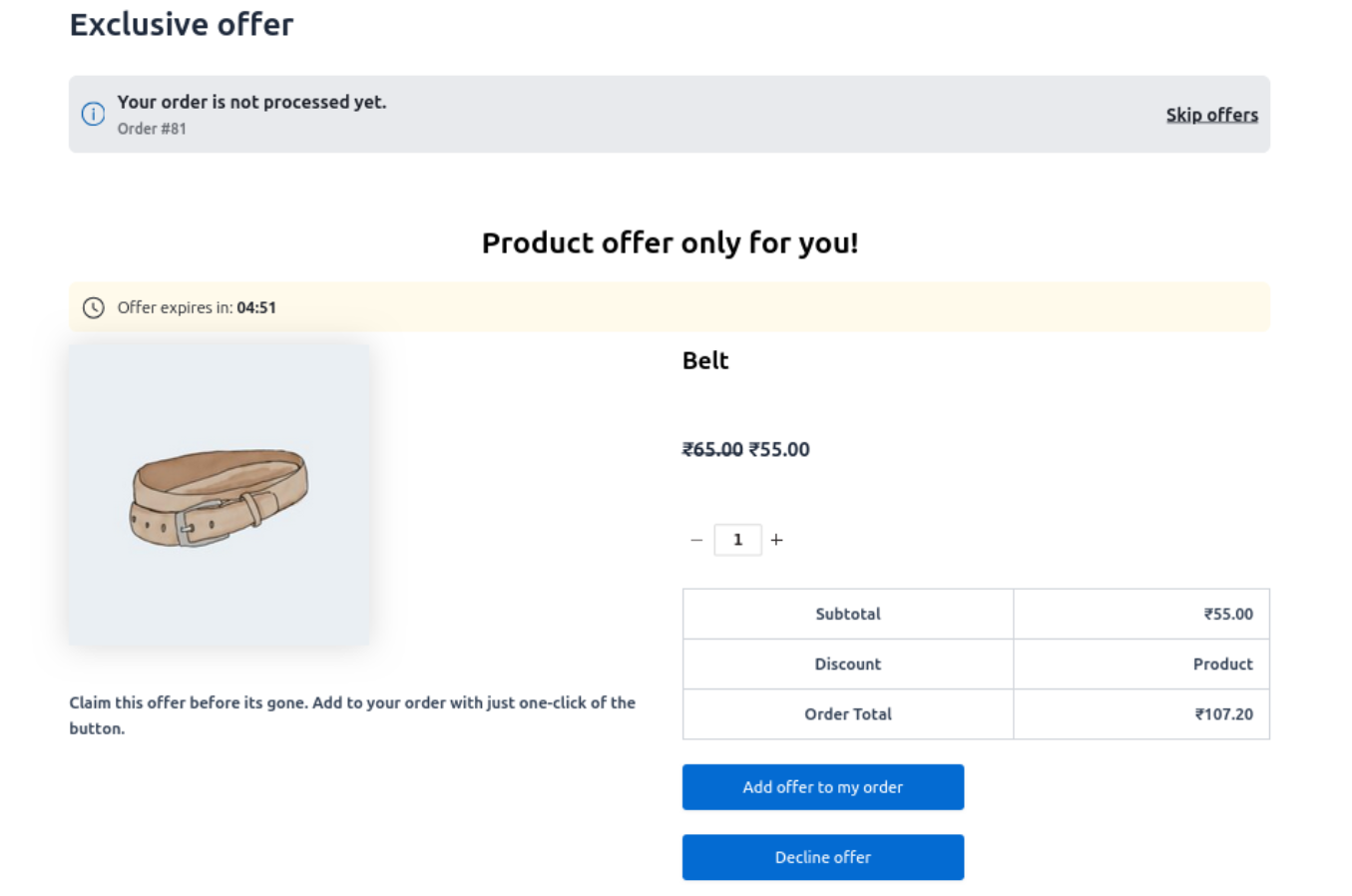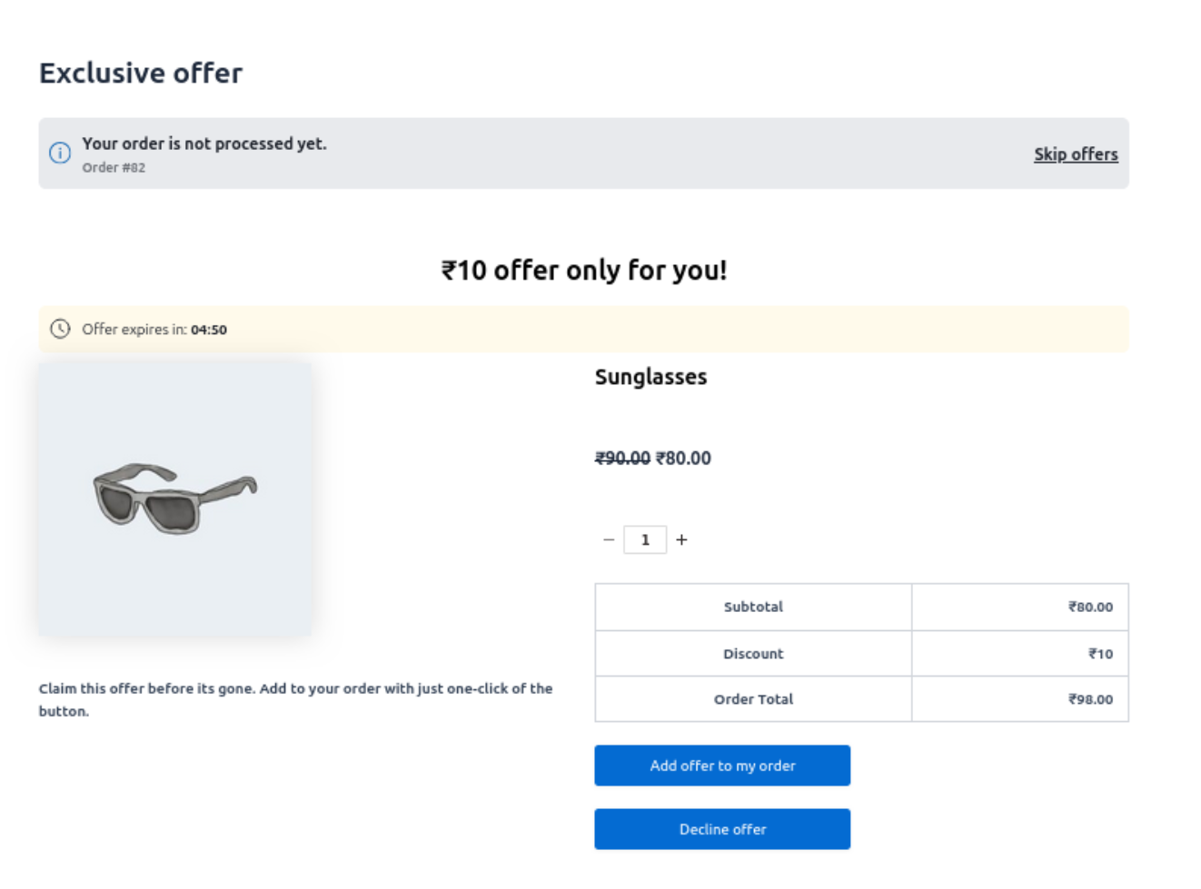 Now the multiple post-purchase upsell offers have been successfully displayed on our offer page. Please ensure to click “Add offer to my order” to avail the offered product, or click “Skip offer” to skip the offer and decline to reject the offer.