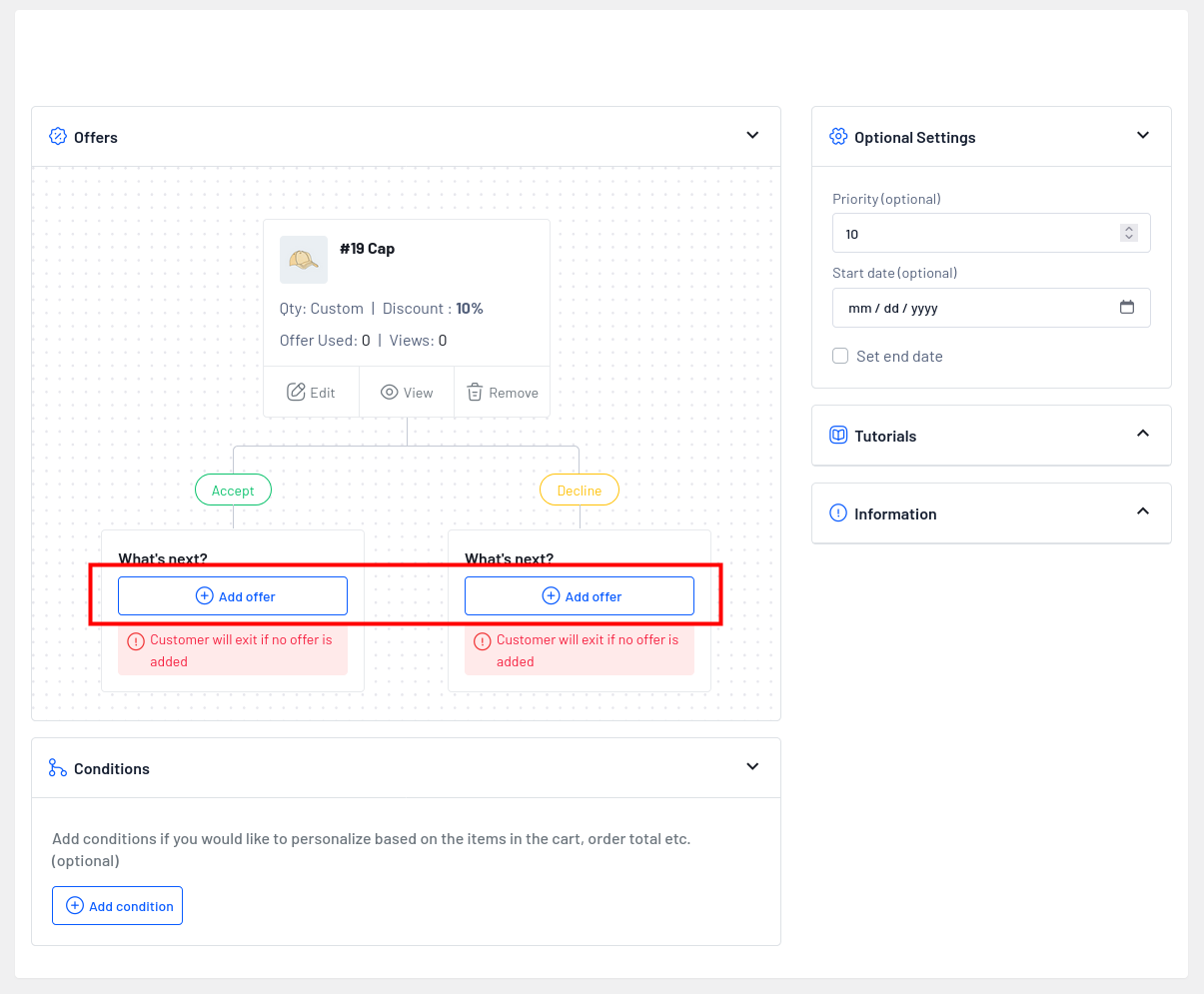 You can configure multiple offers, such as setting the next offer even when the customer accepts or declines the first post-purchase upsell offer.