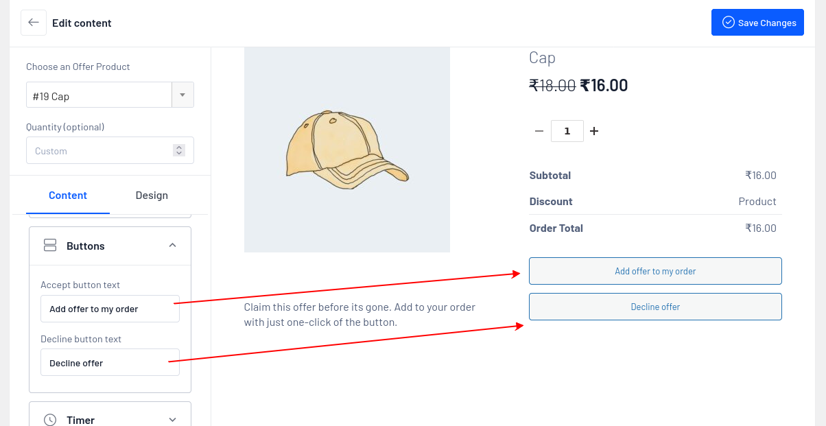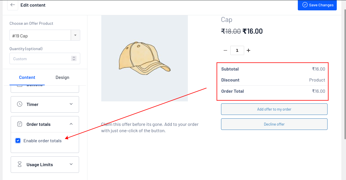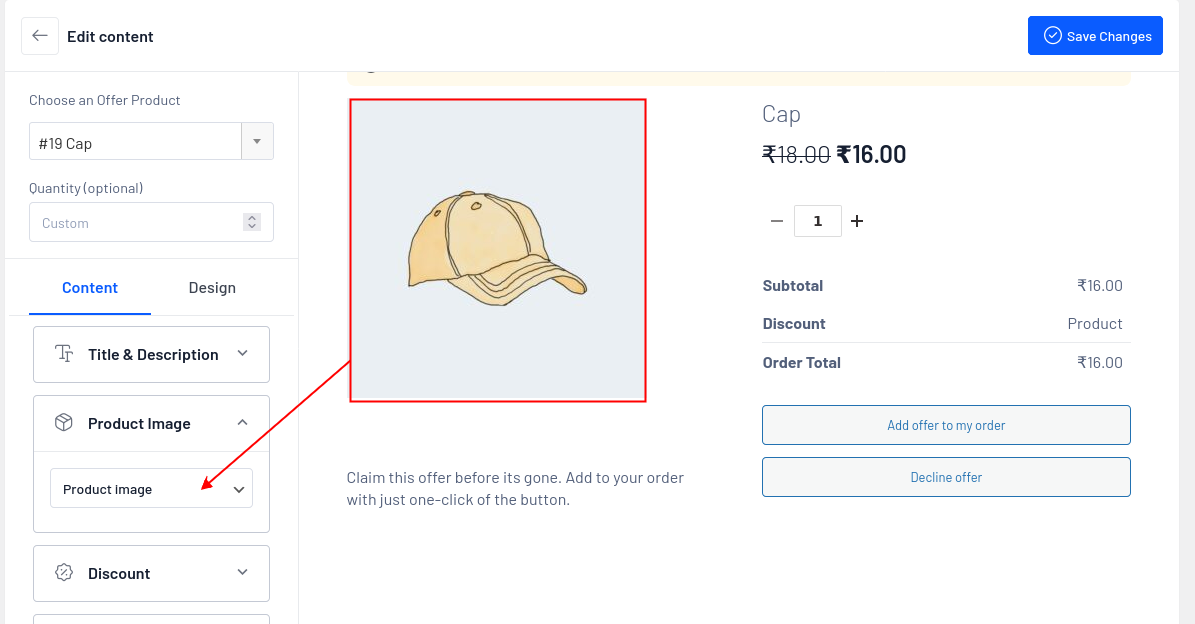 **Step 1:** Choose the first offer product (Cap) that you want to display on the offer page by typing a few characters of the product name and setting a quantity for the selected offer product or adjusting the quantity based on your requirement.
