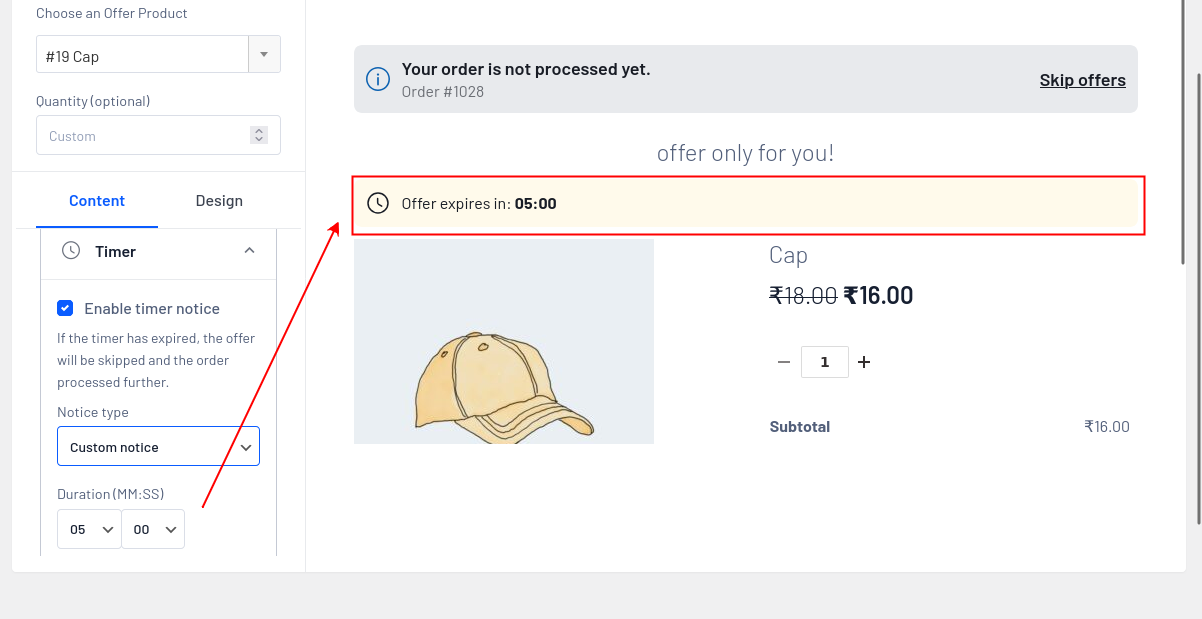 Turn on the Timer option "Enable the offer expiration countdown timer notice?" and you can set minutes and seconds. You can choose other expiration countdown times as per your needs.