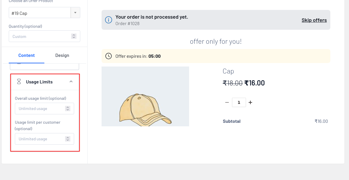 **Usage limit per customer**: The “Usage limit per customer” refers to a restriction on the number of times a specific upsell offer can be claimed by an individual customer. It sets a maximum limit on the usage of the upsell for each customer.