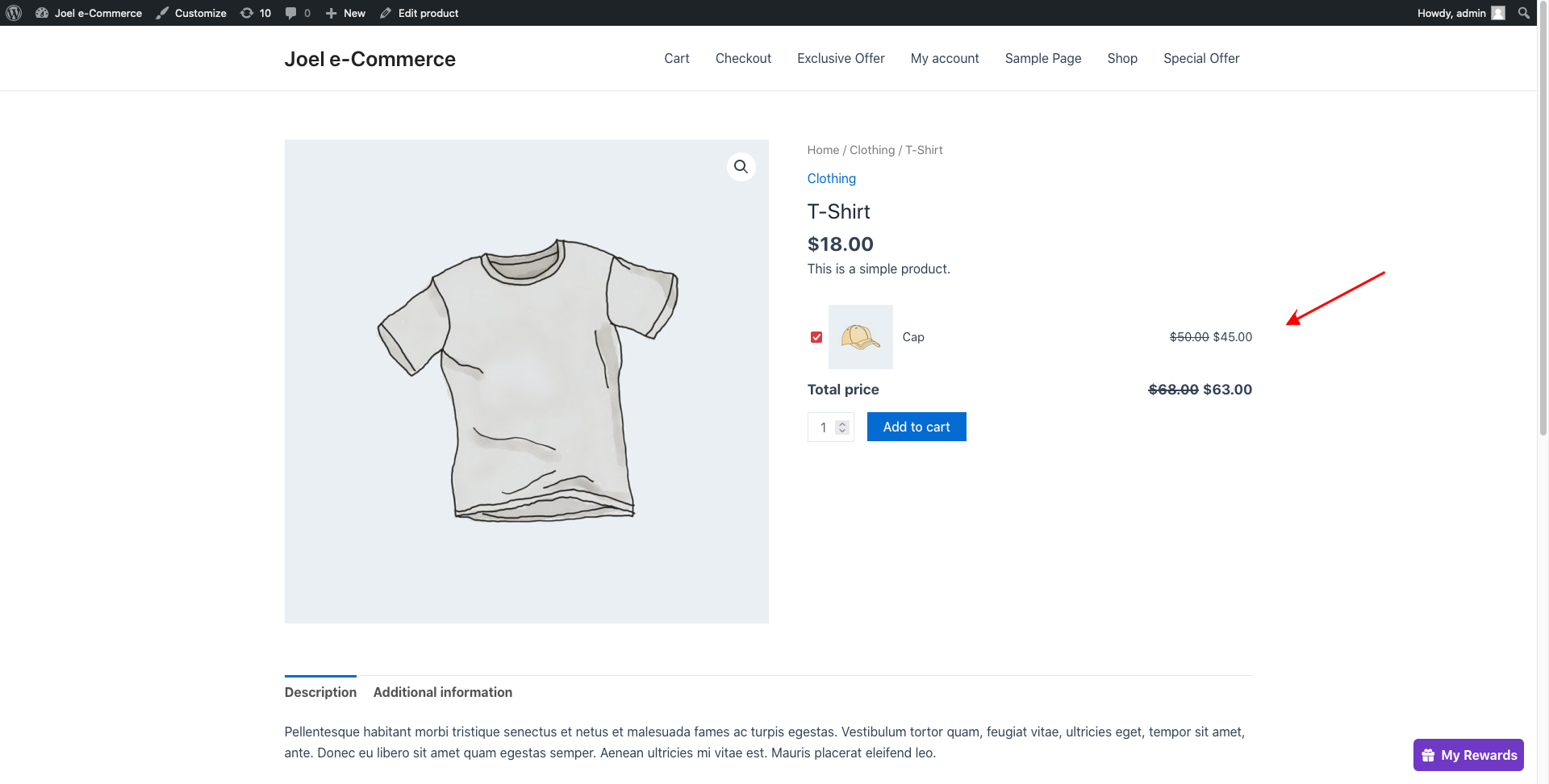 In this scenario, when the customer opens the product page of the t-shirt they have a discount for the Cap of 10% on the product page.