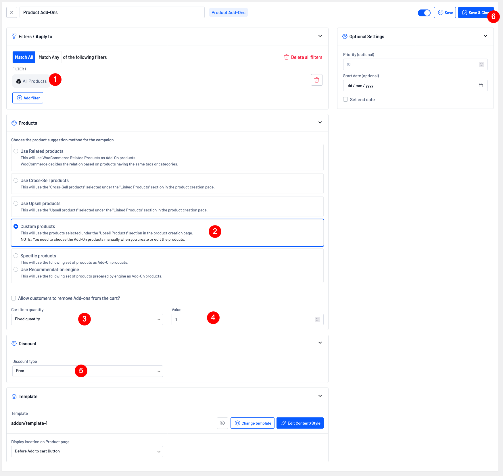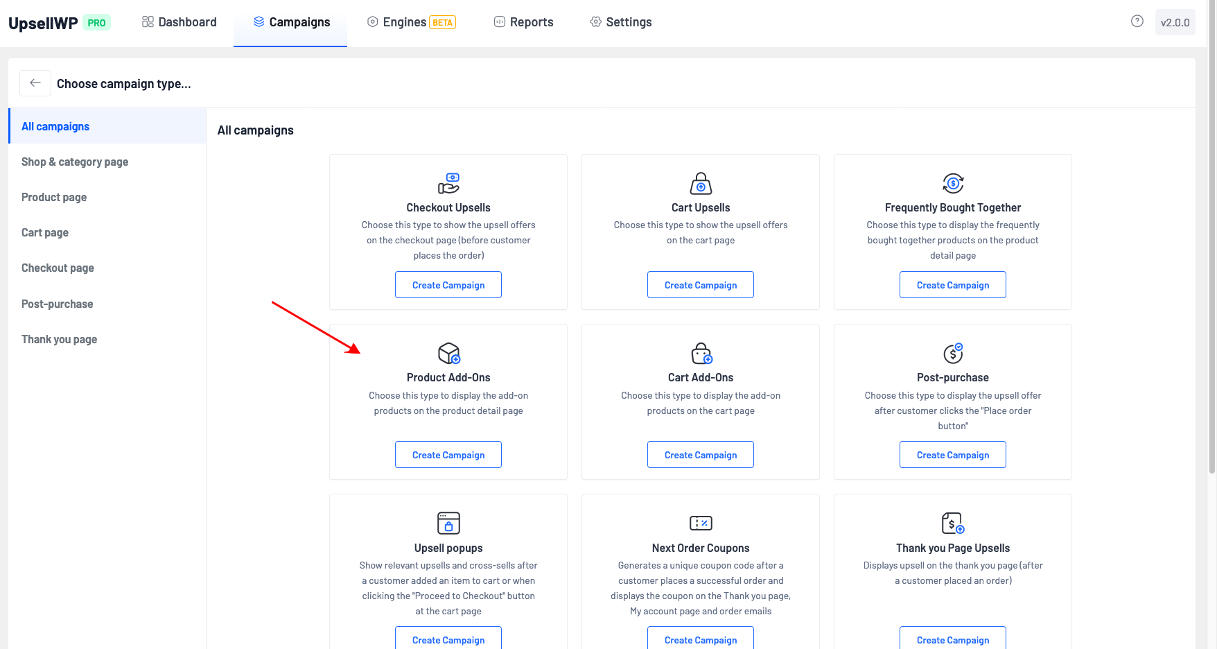 * Go to WordPress dashboard -> UpsellWP -> Create Campaign -> choose “Product Add-on”