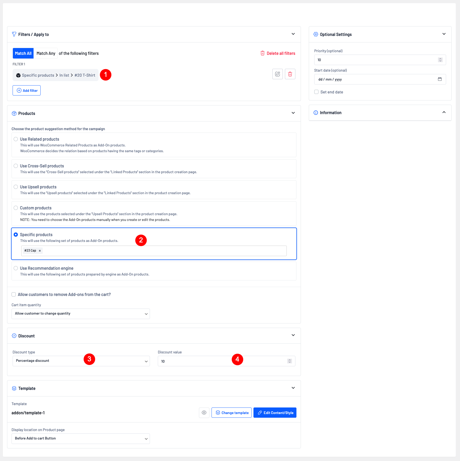 **Example 1: Percentage Discount: Provide a discount on the Product Add-on offer product (e.g., On the T-shirt product page 10% off on the Cap).**