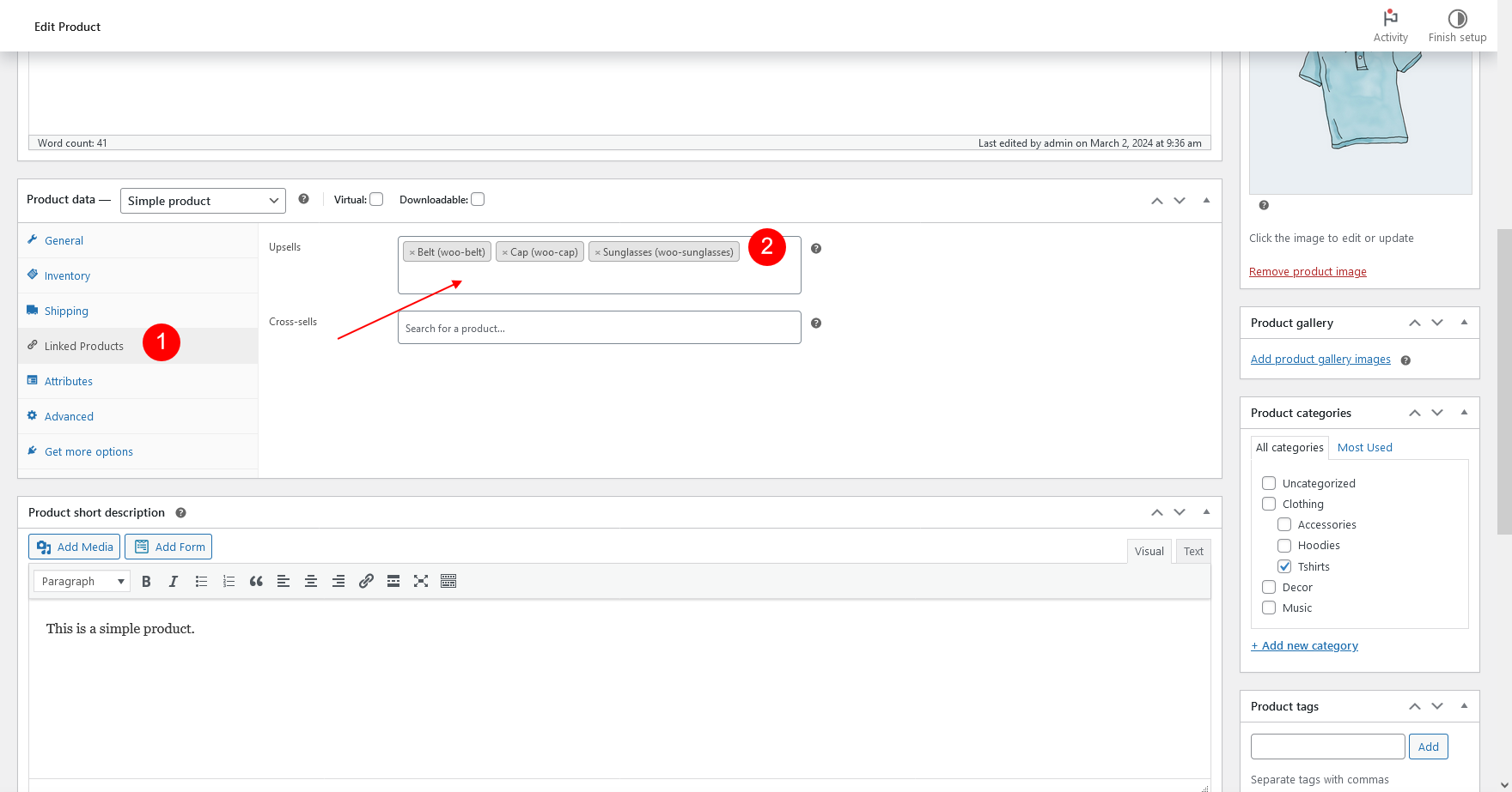 Screenshot showing where the Cross-Sell and Upsell products are configured: