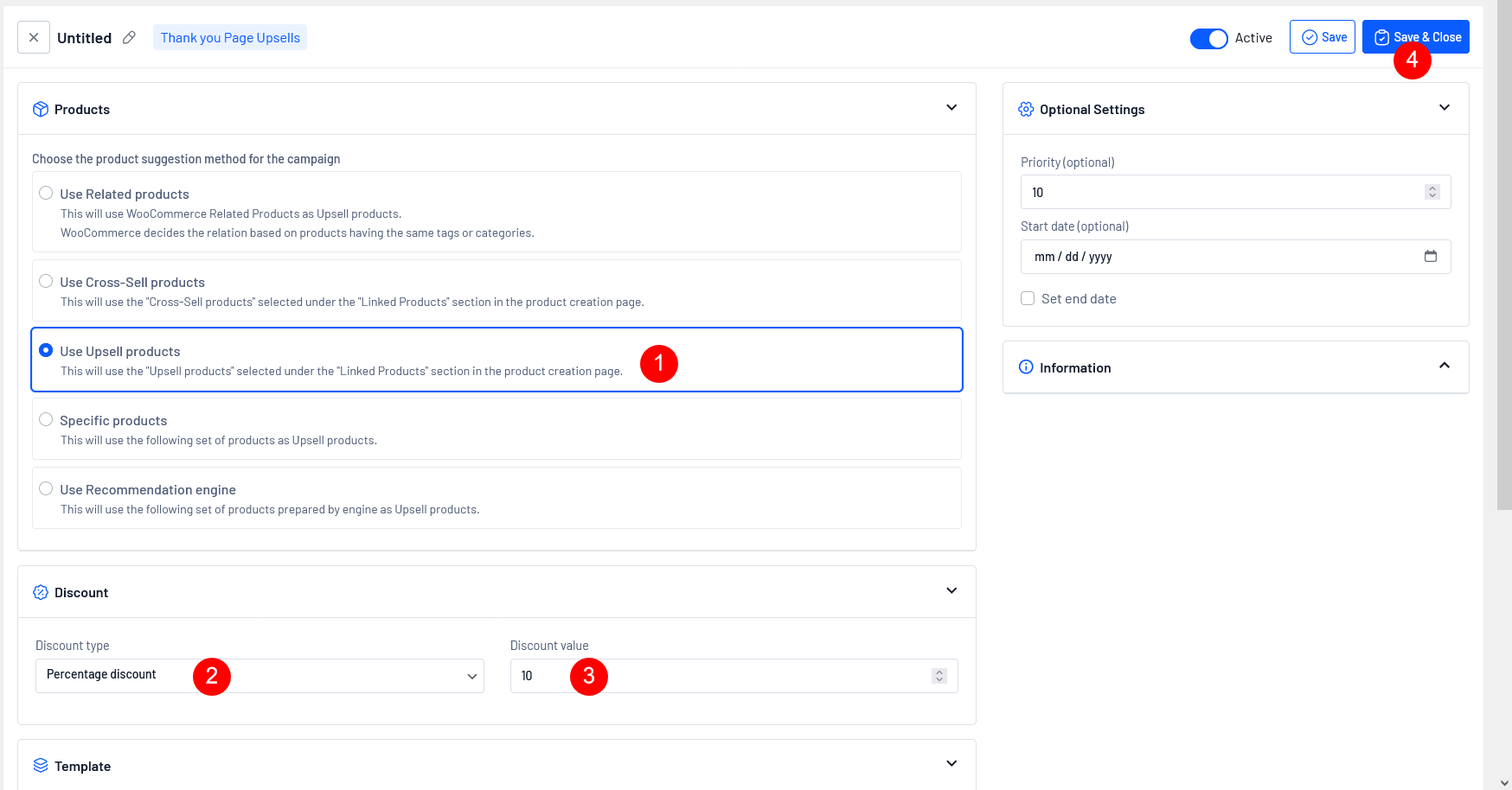 * Go to WordPress dashboard -> UpsellWP -> click on the button "Create New Campaign"