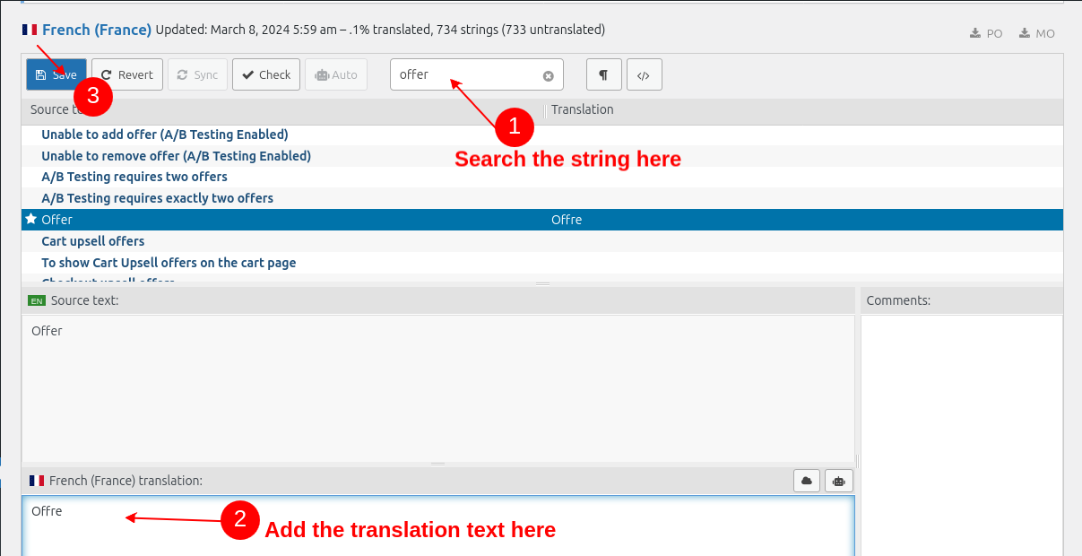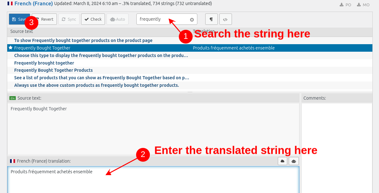 * Click on the "Save" button to save the translated string.