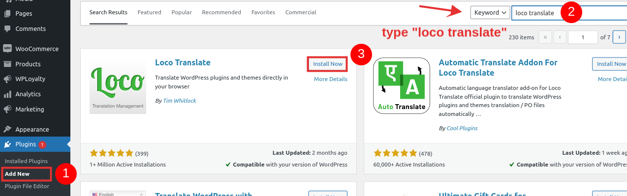 * You will see the LOCO TRANSLATE plugin in the result. Click on Install Now and activate the plugin.